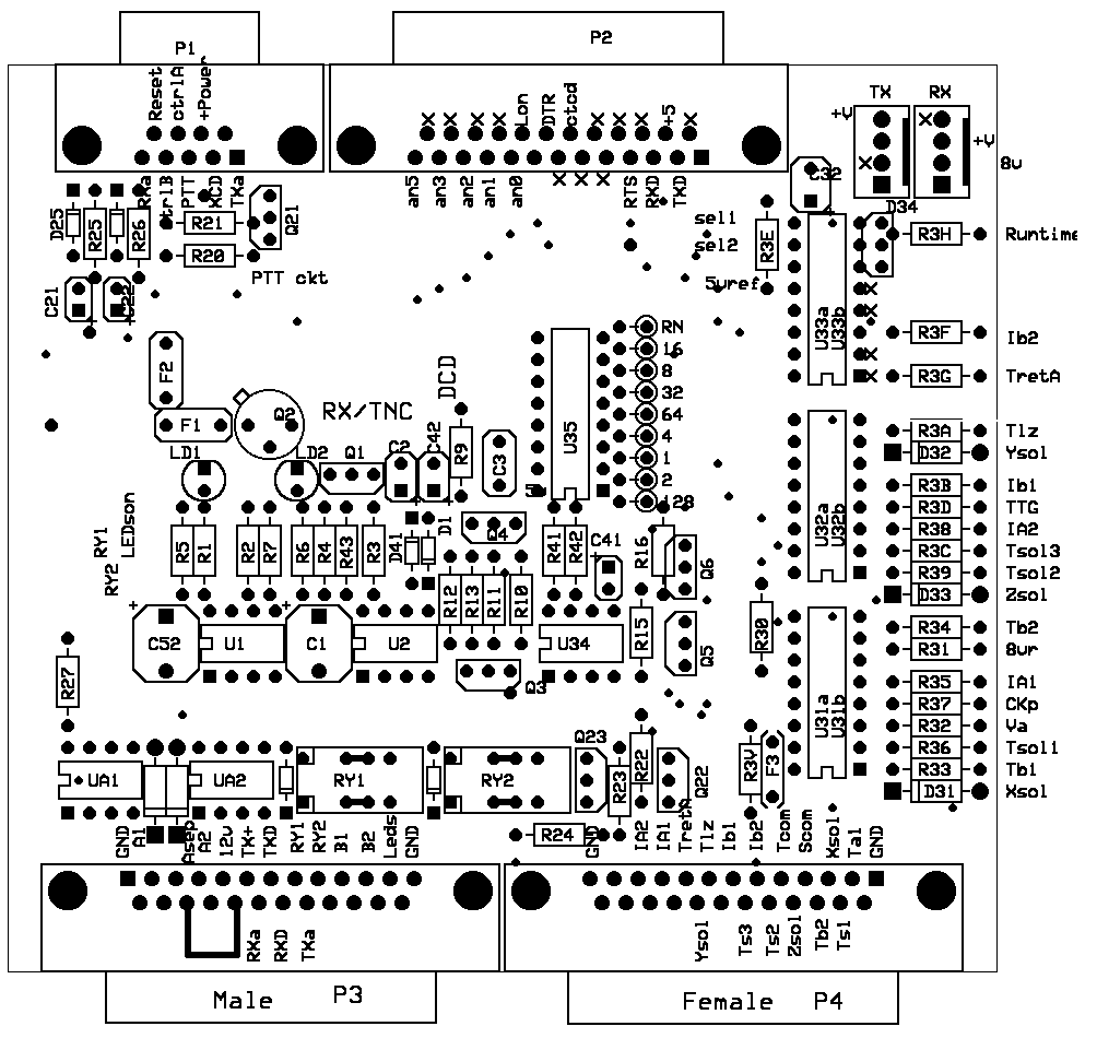 The communications system consists of a Kantronics KPC-3+ TNC, a Hamtronics transmitter and receiver and a custom interface board to hook it all together. These are all mounted in a 1" tall box on top of the battery boxes.