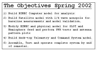 In the spring semester 2002, Midn Patterson (EE Dept) in conjunction with the USNA Small Satellite program under the guidance of LTCL Billy Smith and Satellite Lab Engineer, Bob Bruninga, WB4APR did initial investigations into conformal antennas for such low-drag spherical spacecraft. These showed that the natural resonance of the 17" sphere was near to the amateur satellite band on 146 MHz and if this frequency was used, that the sphere could be used as the antenna itself with no external protrusions. The FIRST SEMESTER objectives below were accomplished in the Spring of 2002.