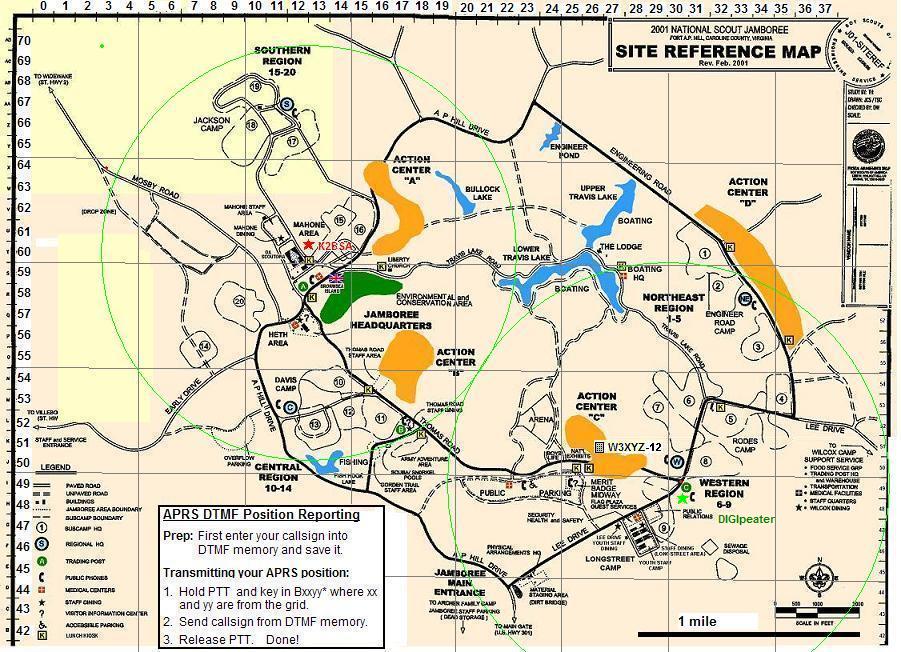 Not only can APRS help you find each other and track your troops movements for display back home, but also your APRS HT can be used for sending back messages and email for scouts to show the value of ham radio in the field. APRS is ideal for field use since it helps everyone maintain tactical situational awareness locally while also providing global connectivity for messaging. You don't even need to bother with a GPS. Just manually enter your position using the GRIDDED map that everyone at Jamboree will have shown below. Just change the last 2 digits in your lat/long as you move about camp and everyone will see you.