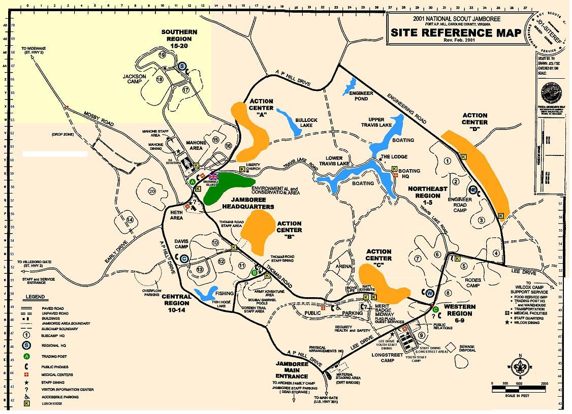 The above map above is the official Jamboree map that everyone at the Jamboree with always have with them. To make it useful for APRS, we have replaced the A-Z latitude grid on the left hand edge with numbers 42 through 66 so that we can use keypad digits instead of numbers. Anyone with this map can report their position using the xx/yy grid and will show on all APRS maps and the global APRS system. Notice all grid numbers will be between 1000 and 3770.