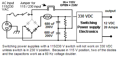 220 VDC Switching Power Supplies: . A typical Ham radio switching power supply is shown below and has the input circuit shown earlier (above). If it does not have an external 115/230 VAC jumper, it may have an internal jumper. Remove it for straight 220 VDC operation.