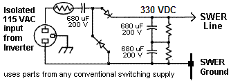 LOAD END POWER CONVERSION: The simplicity of this system is due to the wide availability of universal voltage switching power supplies in consumer products. Almost all laptop power supplies will accept any voltage from 100 to 240 VAC. Their labels say 47 to 65 Hz because that is the specific Underwriters Labs test that they paid for, and there was no reason to validate the device for DC since no conventional DC power sources exist. However, the first circuit in all of these switching power supplies is a bridge rectifier, so DC works just as well as AC (those with a 115/230 switch must be in the 230 V position to bypass the 115 VAC 60 Hz voltage doubler). 330 VDC is the peak voltage of 240 VAC.