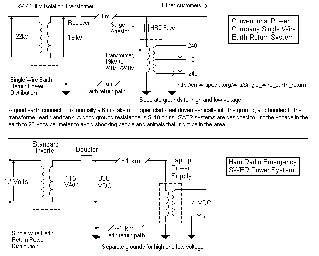 SAFETY: SWER systems preserve safety via isolation and grounding as shown in the figures below. The top image is a conventional SWER system. In the bottom image, our system preserves all the same isolation and grounding as in the standard power systems. In addition to the current carrying SWER grounds, safety is assured by a separate vehicle chassis to-ground rod to make sure that no stray voltages appear on the vehicle. At the load end, after conversion to equipment voltages, an independent chassis ground is also used to prevent any stray voltages that might occur. The only safety issues in a portable system are associated with inadvertant contact with the 330Vdc single wire line. This is averted just like amateur radio operators do routinely with their high voltag wire antennas by suspending them high and out of reach.