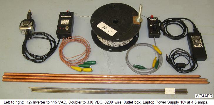 SWER BACKGROUND: To extend emergency power from the Prius Power system, a Single Wire Earth Return(SWER) system is used. My small 6 inch spool of #20 wire can extend the Prius power over 3200 feet or more depending on the length of wire available. Conventional power systems use the SWER technique to deliver hundreds of KW over tens to hundreds of kilometers. Even though copper wire is used, the resistance of the wire over longer distances becomes the dominant factor not the ground resistance that approaches a constant. My 3200 feet of #20 wire has about 32 ohms resistance whereas the ground resistance can be as low as 10 ohms (though closer to 50-100 ohms when my short ground rods are used).