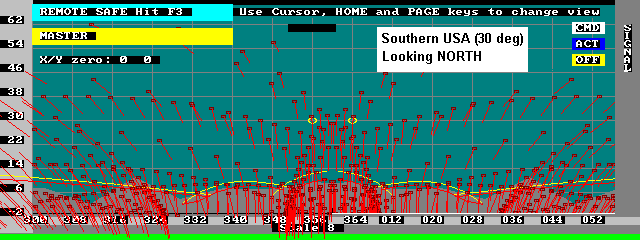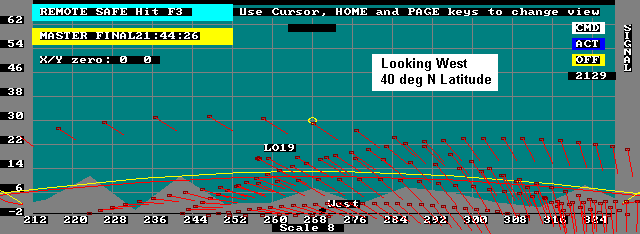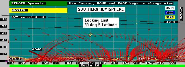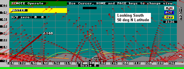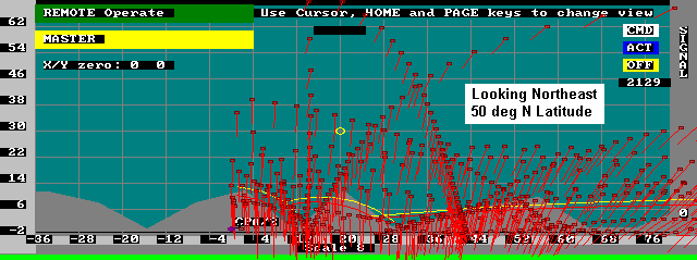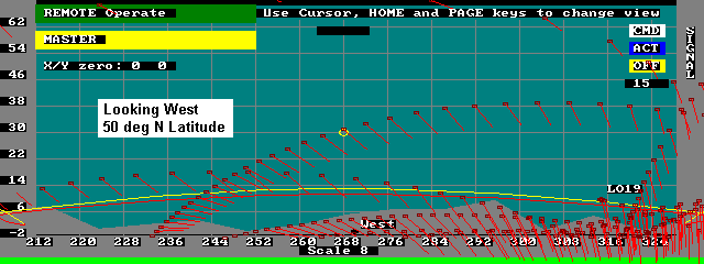 This web page was prepared to help the ground user visualize the satellites attitude with respect to the geometry of passes in his location. To produce these plots, I simply added a vector to the display that I wrote for some of my tracking programs. The vector is shown in the direction of the Earth's North Magnetic pole as it would appear to the satellite observer looking in the given direction.