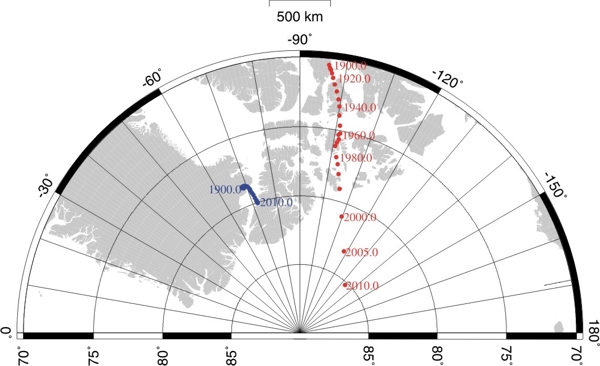 earths magentic pole is located. The blue plot is the point where compasses generally