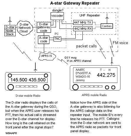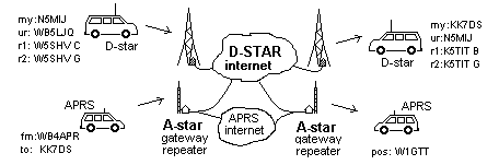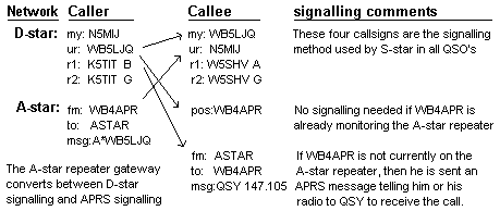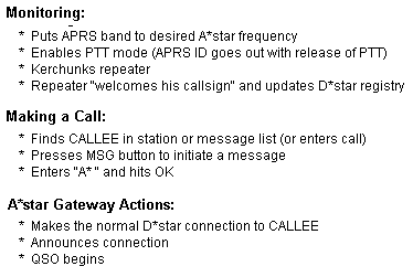 A-star to D-star call: This is as simple as making a D-star call on a D-star radio, except that the A-star user enters the target callsign into an APRS message beginning with "A*". The A-star repeater gateway converts that to the streaming D-star callsign and the D-star network handles the rest. If the callee happens to be another APRS user, then an advantage of this APRS signalling is that he does not even need to be on the A-star frequency but can receive the APRS message and he or his radio can instantly QSY to receive the call. Of course, once the A-star repeater makes the A-star user appear identical to a D-star user, then everyone can talk to anyone in the same manner. Everyone appears on the D-star network as a D-star user.
