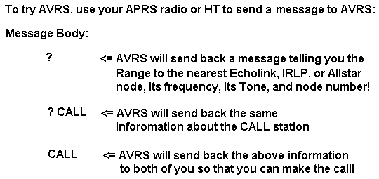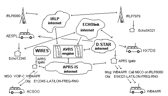 As seen below, the AVRS engine interacts with the APRS-Internet system and monitors the status of all IRLP, ECHOlink, D-STAR and WIRES nodes. Being fully aware of everything needed for end users to find each other, calls, locations, frequencies, PL's and status, the AVRS engine's job is to pass the needed information and messages to the end users to help establish the call: