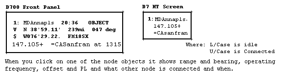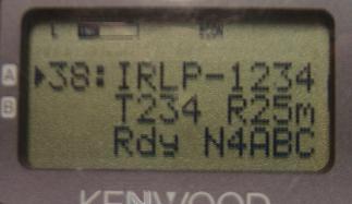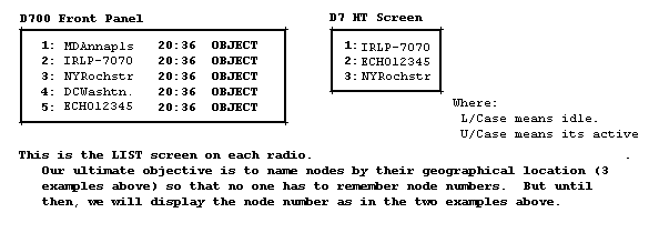 NODE OBJECTS: . As of 2007, we have made substantial progress on the first 5 items above. . Many Echolink, IRLP, D-STAR and WIRES nodes now appear on the air and most importantly on the front panel displays of mobiles and HT's as shown to the right on the D7 HT. These photos need to be taken again, since they are not showing the Frequency of the node which is also very important. The proper formatting of these objects is shown in the Echo-IRLP-Win.txt file.