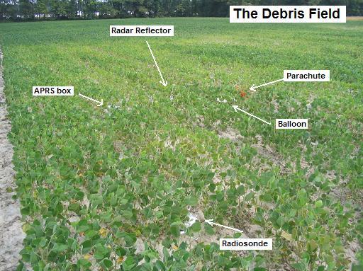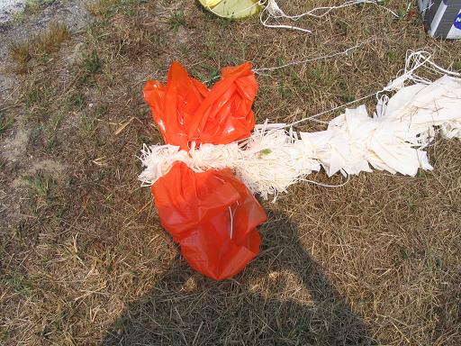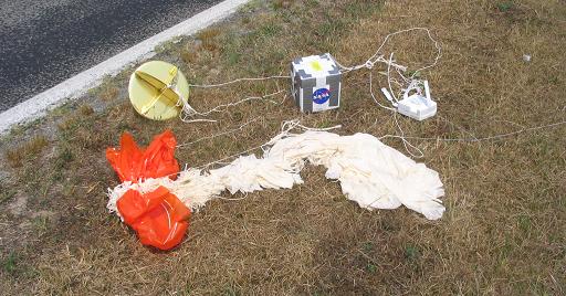 Even though the field was only covered in 1 foot tall plants, the flight hardware was not visible until I got within 35 feet. THe view below is at about 20 feet and shows the placement of the various components of the flight package as they had landed.