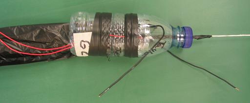 This one was assembled for a water landing (high probability in our area) by placing it in a lightweight water bottle. The black plastic bag on the left serves as a"streamer" to slow its descent.