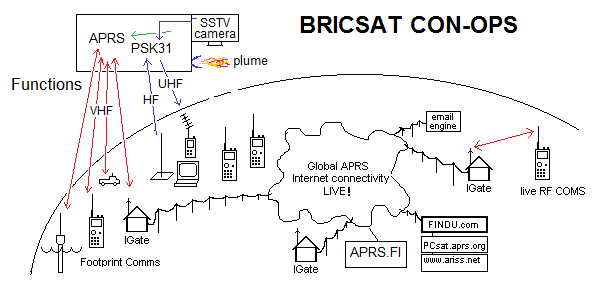 BRICSAT was to continue the PCsat(2001) and PSAT(2015) missions noted above containing an APRS packet radio communications transponder for relaying remote telemetry, sensor and user data from remote users and amateur radio environmental experiments or other data sources back to Amateur Radio experimenters via a global network of internet linked volunteer ground stations. The APRS transponder also includes telemetry, and some command and control for the user modes.