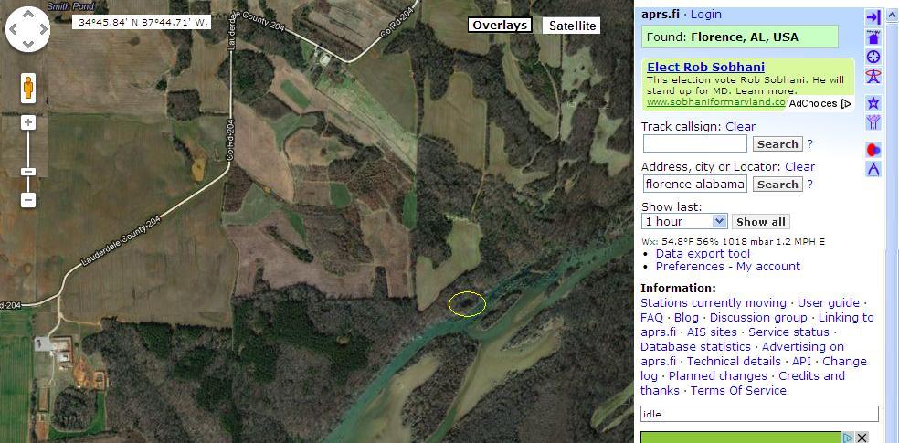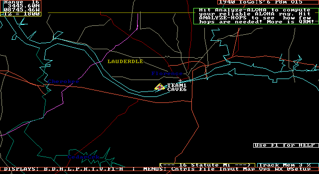 The above maps were the hand-made vector maps of the 1990's APRS system. Now APRS is fully integrated into Google maps as shown below. Just go to the global web page http://aprs.fi and enter Florence Alabama. Then zoom to the exact coordinates (maybe 34N 45.83 and 87W 44.71?). Anyway, imagine if you could see on this map the locations of people IN THE CAVE using this technique (assuming they carried with them a copy of a geographically correct map of the cave for entering their coordinates).
