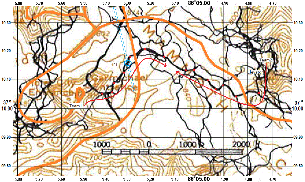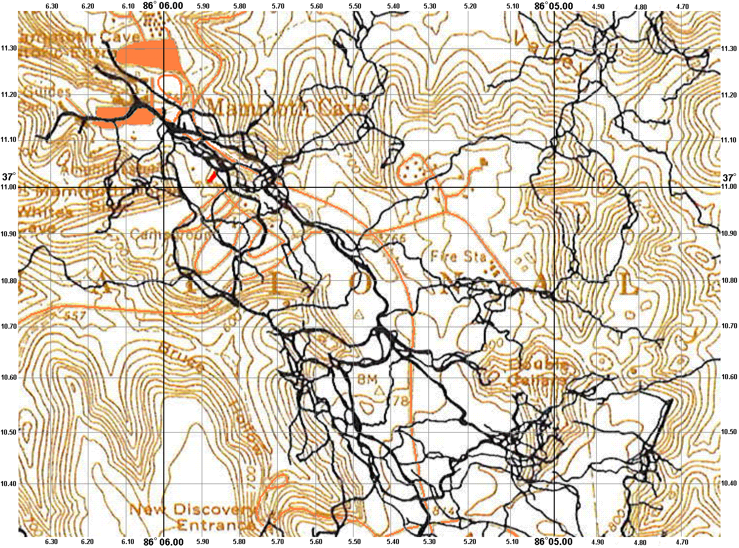 POSITION REPORTING: Of course GPS does not work underground, but any two people looking at the same map can report their position by simple grid marks on the map. The resolution and accuracy is as good as the map was drawn and the precision of the person estimating his coordinates on the map. As long as the cavers have a paper copy of a gridded map which is the same as everyone else including observers topside, then everyone will see where everyone else is on that map. The caver just manually enters his lat/long by looking at the grid on his paper map! For exxample, this version of the map has the grid overlayed. Team1 is located at N34 45.93 and W87 45.35. It does not matter if this is geologically accurate or not. What only matters is that everyone is using the same copy of the same map. Please see the detail hand map for Mammoth.