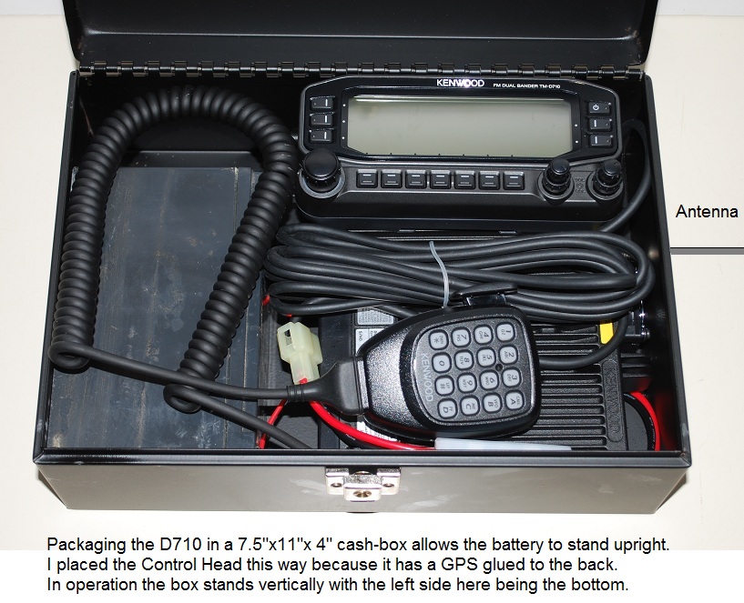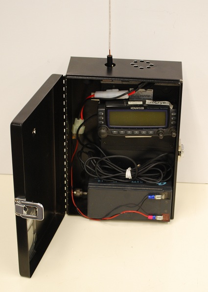 boxes contain D700 or D710 APRS radios and a 9AH gel cell battery. They are shown here