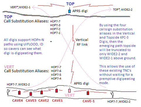 PATH CONSIDERATIONS: The problem is, how to truncate the cave path so that it is suitable for the existing topside APRS system (limited to 2 hops). This has been solved using existing hardware by assigning the higher path counts as SUBSTITUTION-ALIASES in the VERTical and TOPside digipeaters of such a vertical link as shown above right. All cavers would use the path of HOP7-7,WIDE2-2. This works everywhere even topside since all HOPn-N part of the path is replaced by the digipeater TOP or VERT callsigns and then only the WIDE2-2 or WIDE2-1 continues topside. Notice that an IGate must be within one digipeater hop of the TOPside digi because both W2-2 and W2-1 can occur. This quirk is because only 4 such aliases are possible in each digi. This quirk would go away if the TNC's either had 7 potential aliases or if they provided PREMPTIVE digipeating that would automatically truncate all-prior paths. But at least it gets us operating now. If cavers transition to H77,H77,W22 at CAVE7 and beyond, then they have coverage all the way out to CAVE14, but this path fails if they try to use it at CAVE4 or 5.