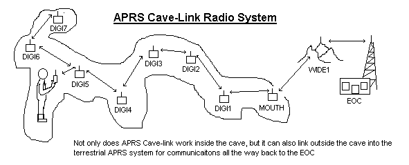 APPLICATIONS: We anticipate this APRS communications capability will have value in long expeditions underground when there are significant obstacles that slow ingress and egress. By transiting these difficult areas of a few hundered feet with APRS links instead of wire or runner, then communications with the topside or base camp are easier to maintain.