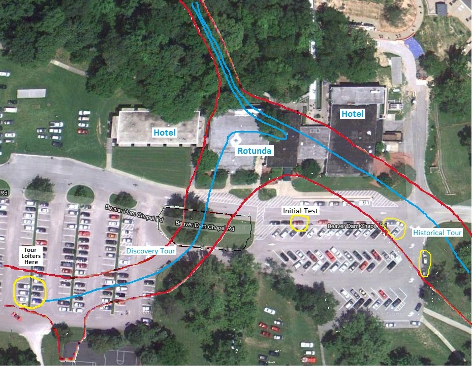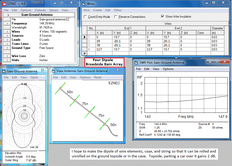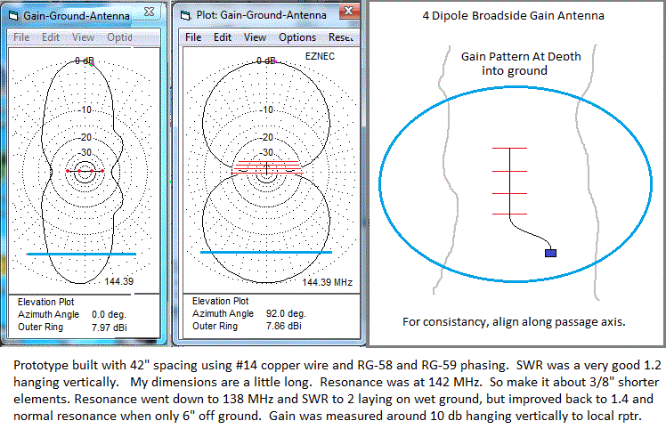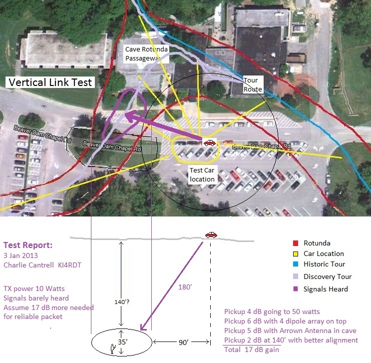 Preliminary Packet Penetration Test Results: On 3 Jan 2013, KI4RDT parked his car in the Hotel parking lot with a dipole antenna on his mobile APRS packet rig beaconing every 12 seconds and took the Discovery tour through the Cave's Rotunda room. He heard packets solid into the entrance up to the metal gate. Then nothing until a few open-squelch bursts in the Rotunda as shown on this map. These weak bursts showed that we are within about 16 dB for a successful packet link. We can gain this with a topside four-dipole-array , a 3 element arrow antenna in the cave, 50 watts from the mobile, and better alignment directly over the caver. See the gain pattern for the 4 dipole array. It has no boom so it can be rolled up for easy transport. We can get 2 dB more gain if we park the test car on top of the test location (as shown here).