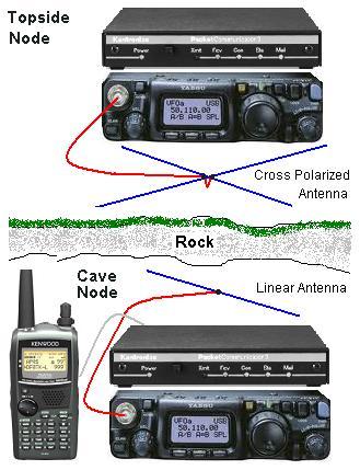 linking upward throught the rock using VHF and 50 Watts up to 140' and maybe up to 300' or so using HF links.