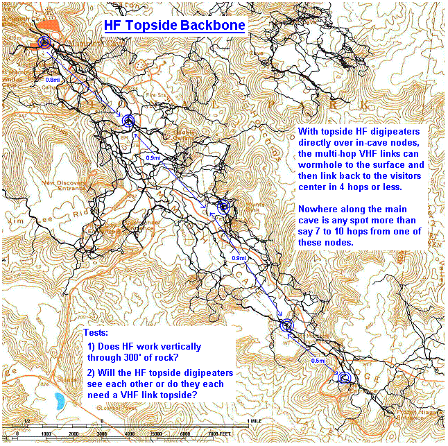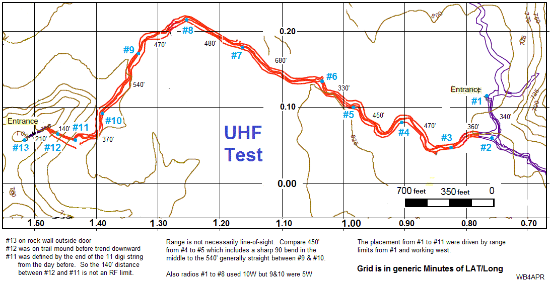 The scale map above shows the approximate location of the UHF digipeaters and the lengths of each link. Notice some are more or less straight and some are almost as long but have significan bends. Since RF absorption is the main limiting factor, most of our practical experience with radio propogation must be relearned in this environment. This same 14 hop APRS link along the Appalachain Trail can cover the 2000 mile distance from Georiga to Maine, yet here underground, it only goes one mile but can still be useful.