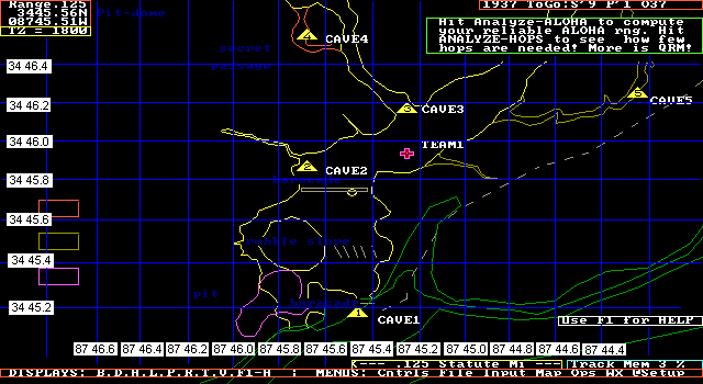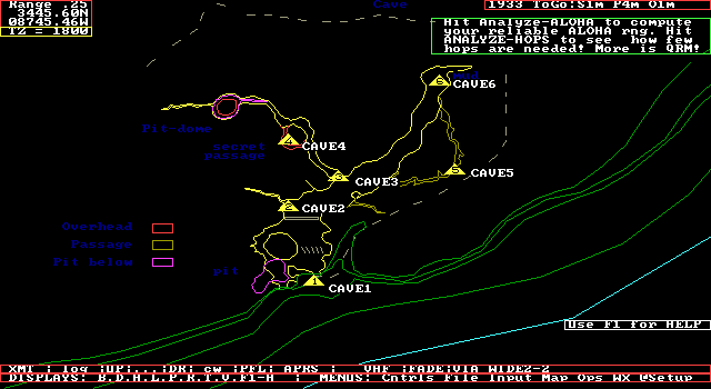 MAP DRAWING: All of the cave maps above were drawn in only about an hour using the MAPFIX.EXE program provided with APRSdos (back in 1997). Remember, since GPS is not used inside the cave, the map can be any free-hand sketch that visually represents the best known knowledge of the cave. As long as everyone then uses the same map and grid, then everyone will see the same tactical situation independent of the absolute LAT/LONG coordinates. This includes objects and notes placed anywhere on the map by anyone above or below ground. These days, the overlay Cave route would need to be vectorized in the original APRSdos .POS format or in a GPX format for working with Google Maps.