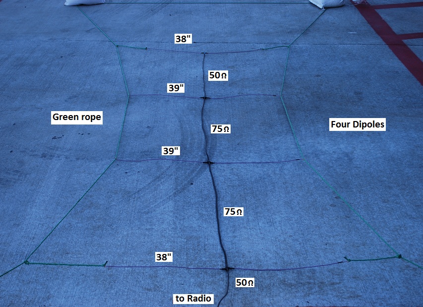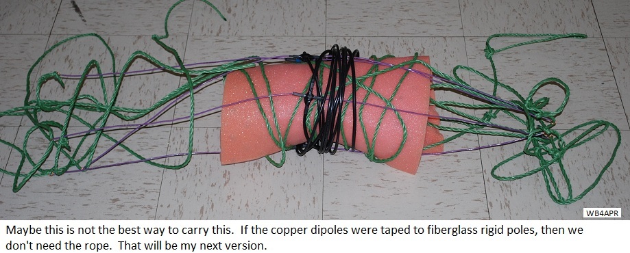 Four Dipole VHF Gain Array: The photo below shows the design of this 9 to 11 dBi VHF gain antenna that can be layed on the ground above the cave or in a passageway. This plus 50 Watt radios can hopefully make VHF packet work through about 150' of relatively dry rock. The elements are made from #14 electrical wire and are held in place with a catenary of rope. This seemed like a good idea until it was rolled up for carrying. It's a mess. My next version will tape the elements to small fiberglass rods that will hold the dipoles straight without all the rope.