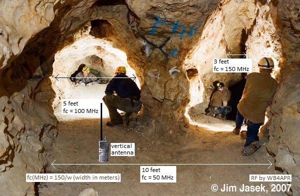 Waveguide Effect: For what it is worth, VHF should theoretically work OK in conducting metal passages down to about 4' wide for a vertical antenna as shown below right (staying well above the 3' cutoff). The theoretical high-pass cut-off frequency is as shown (all freqs above that freq will pass). The cutoff dimension is determined by the horizontal width for a vertical antenna or by the height for a horizontal antenna. Of course, cave walls are not metalic and act more closely like anechoic chamber attenuators snuffing out RF over very short distances. Some people say UHF does better in a cave, but then it has 10 dB more path loss and only a foot between nulls (more critical placement?) But to go through rock and earth it is well established that the lower the frequency the better. Operation below even 1 MHz is preferred for greater penetration typical for vertical links to above ground.