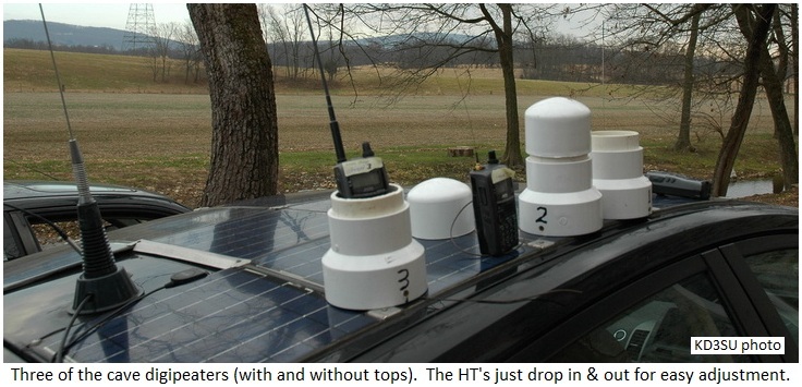 Photos including ones of the digis and a map of the cave will eventually get tot he web page. TO hold the HT digi's upright, I used a 4" to 3" PVC pipe adapter and a 3" pipe cap. The full size HT antenna poked up through a hole in the pipe cap, and the bottom oft he 4" adapter had a 3/4" thinck base. Inside was a ring of foam to hold the radio from banging around. A 19" counterpoise wire was screwed under the belt-clip screw and dangled out the bottom.