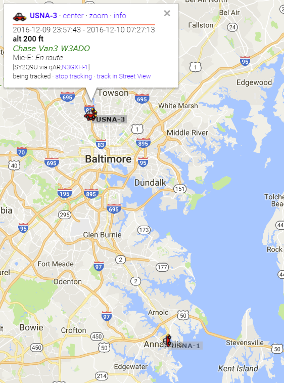 Actually, once you are on the google page, you can also simply hit the select all link to include all hamradio callsigns on the same map, then zoom around to see all surrounding vehicles. You will also see all of the other Ham radio operators using our APRS tracking system developed here at USNA.