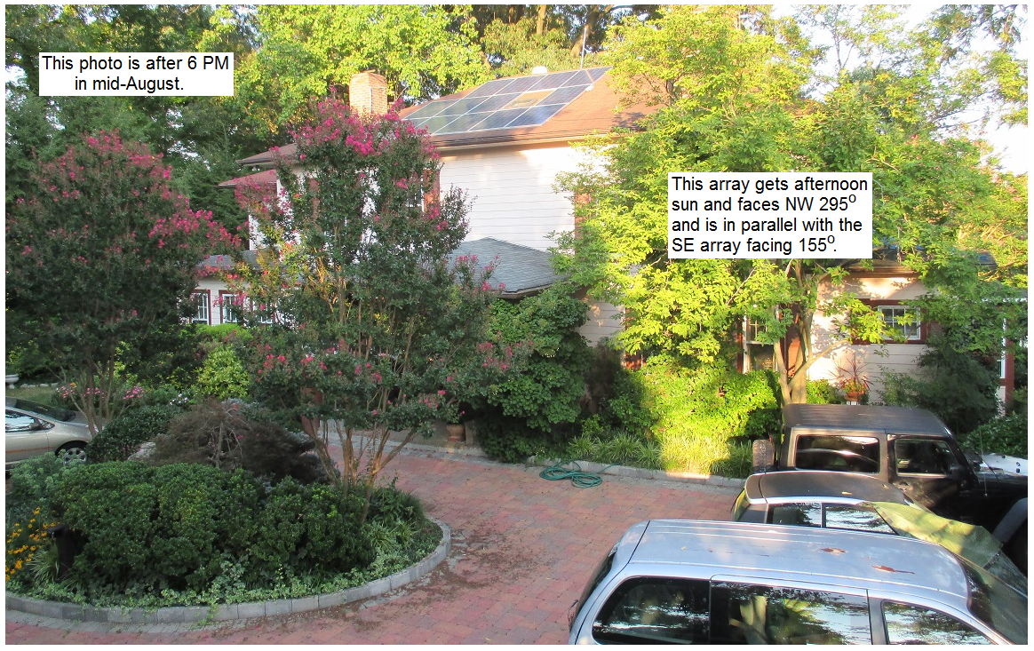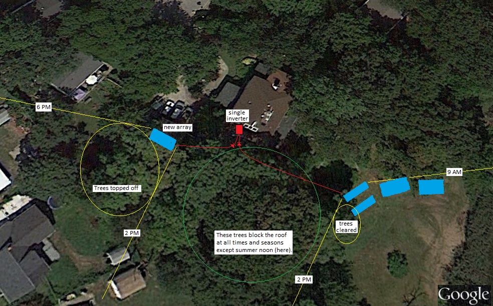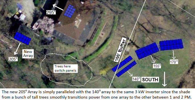 Our original southeast facing three-array 8 kW system is visible on the above right. It favors the southeast because of a clump of shade trees to the west that begin shading the panels after 2 PM. Comparing this to similar arrays, this limits our array performance to about 90% of what an ideal array would produce. In addition, having switched from heating oil to Geothermal Heatpump to stop burning another 1000 gallons of fossil fuel every year, our electrical load went up. To compensate for both of these factors, we added an additional 3 kW array facing southwest on the garage roof as shown. Once the original southeast facing system was permitted, approved, in place and grid-tied, adding these additional panels was very cost effecitve as they did not need an additional inverter. These new panels are diode-paralleled to the most east facing of the southeast arrays (to minimize Sun overlap). As the southeast array becomes shaded by a bunch of trees, then this southwest array is just beginning to get sun. This way, we get dual use from the same inverter, as it now has Sun twice as long each day due to the second set of panels. See shading image in summer.