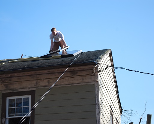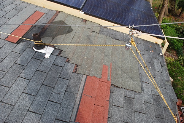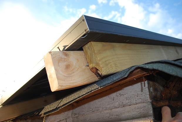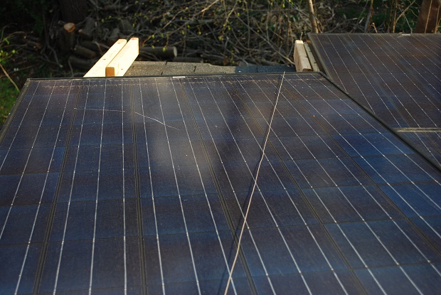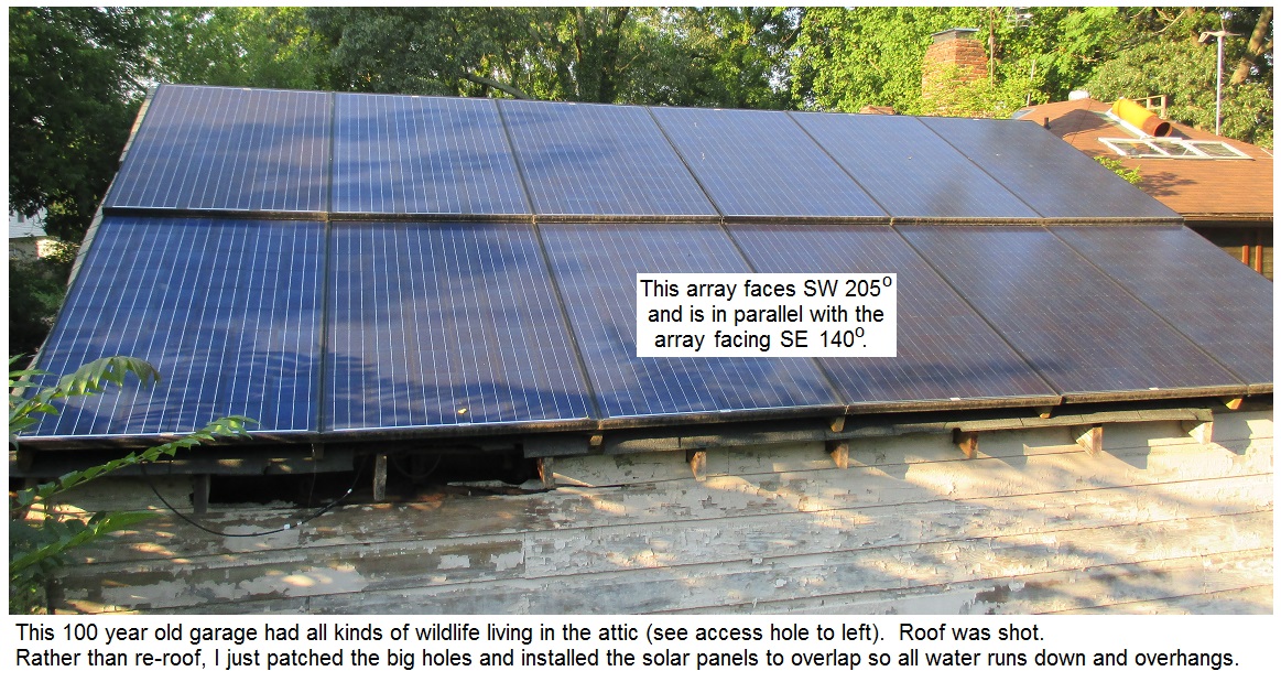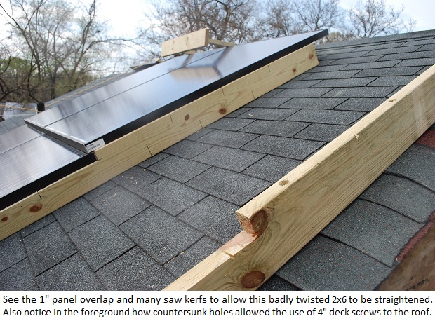 Roof Repair Avoided!: The other reason for this project was to fix the roof. Rather than spending lots of money repairing the roof and then covering it with expensive solarpanels, we designed the solar panel system to be water proof so that we did not need a new roof. As you can see in the above picture, the big holes in the roof (one as big as a football where a Raccoon was nesting in the attic) were simply covered with extra shingles. The wooden 2x6 rails for mounting the solar panels can also be seen to be slightly notched on the bottom edge to allow for the added shingle thickness. You can also see how the top row of solar panels was designed to overlap the bottom row by one inch . This assures that water flows across the junction and there was no need for any weather profing between the panel rows. The crack between the vertical columns of solar panels is less than 1/16th inch and are raised above the surface of the panels so it is unlikely that any significant water will get between them. If so, a simple caulk gun can seal the gap.