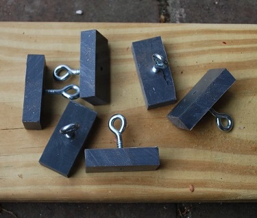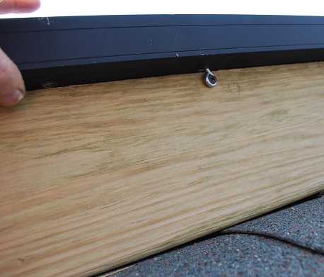 Attachment Scheme: The panels are held in place by screweyes into PVC blocks as shown here. I assume wood can also be used, but I had the PVC so used it. The screweyes pass through the pre-existing mounting holes as shown far right and then hang down between the 2x6 rails and are attached to the rails