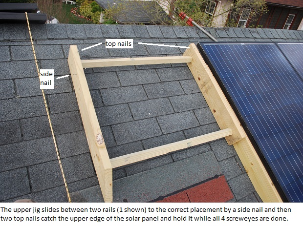 Then the bottom panel is slid into place from above and caught at the bottom by a second set of nails on the lower jigs. Then moving to the trolley system to reach under from below the lower panel, the panel is pushed up the 1" under the top panel and then the lower two screweyes are secured. Of course, installing the last lower panel was a challenge for a single person, so it was slid down into place against the temporary lower jig using wires from above..