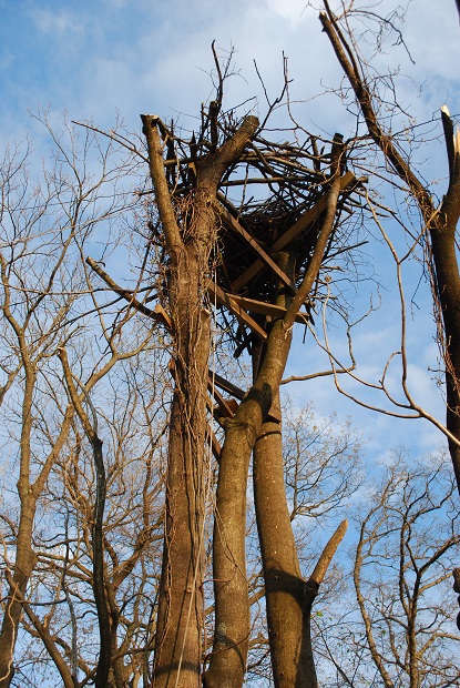 Eagles Nest: Since the wasteland of junk trees-of-paradise had to be topped above 30 feet to get sun to the garage, the 30' stumps looked pretty naked. As a result, we spent a day building an eagle's nest in case anyone was looking for a home. So far, it is mid spring (April) and no Eagles nor Osprey have ventured near, though it has been