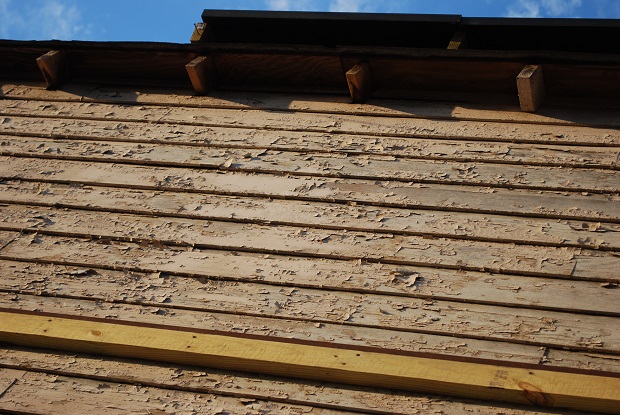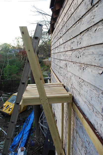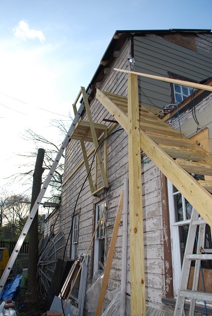 Multifaceted Project: There were several wide ranging factors involved in this project, not the least of which was overall maintenance and repair of this 90 year old garage which was falling down, full of leaks and rotting foundation. As you can see to the right, there is a lot of cleanup in progress. The half finished roof array can be seen here, as well as the terrible need for a paint job (which entail siding and a vacuum cleanup of all the surrounding dirt to capture all the old lead paint). Another significant effort to be able to access the lower edge of the solar panels on the high roof, I had to build a stairs and walkway. Instead of a walkway, I changed to a small trolley platform that can roll across the entire width of the building.