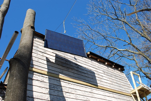 Panel Raising Pulleys: Also visible in the above picture is the wire-rope and pully system used for rasiing the panels the needed 30' to the roof. A sliding block slides along the wire rope (supported between the Eagles Nest and my car bumper 60 feet to the left) and also supports a 2-to-1 mechanical advantage rope/pulley system for raising the panels from the ground. Then they were stacked on the roof for later install.