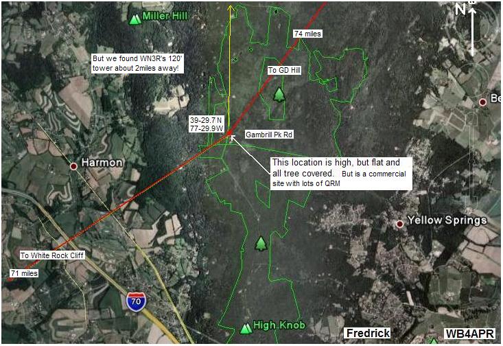 Looking at Google Earth reveals a high point on Gambrill Park Road that has good line of sight to GD Hill and back to the WV mountains (White Rock Cliffs). But the problem was the trees and the need for a very tall mast to clear the trees. BUT... all has been solved as WN3R has stepped forward with his 120 foot tower in his backyard, right where we were looking! To see all the other places we looked coming in from WV, click here, or see all the potential paths across PA.