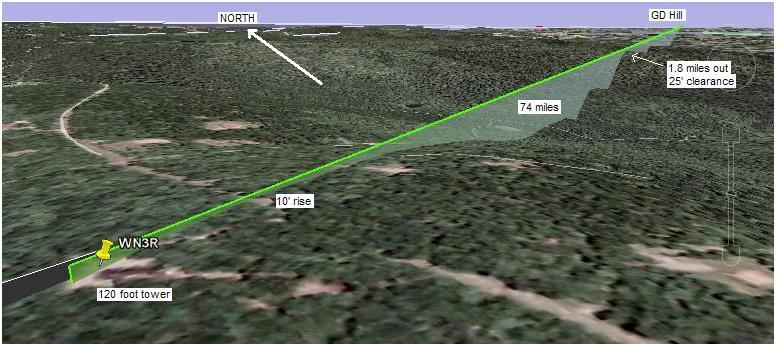 From WN3R's 120 foot tower, then the shot further to the Northeast has to clear a similar ridge about 1.8 miles out. Google Earth shows that he clears the ground by 25 feet or so, but then the height of his tower adds to that, to get well above the trees. This shot shown below should have no problems to Governor Dick Hill lookout tower. as shown in the accompanying RF plot by KX4O.