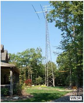 So we found the high ridge along the Gambrill Park Rd on Catoctin Mountain. It is tree covered but appears to have several houses along the road but set back out of sight. The path to the southwest gets through a narrow break in the western ridge towards the WV mountains, and to its northeast, it is not blocked by any other high land. It is only at 1730 Feet, but appears to be the best we can find. We welcomed any site in this area that has easy drive-up access, and can see both directions with a minimal mast. And up stepped Dick, WN3R. Check out his tower to the right: