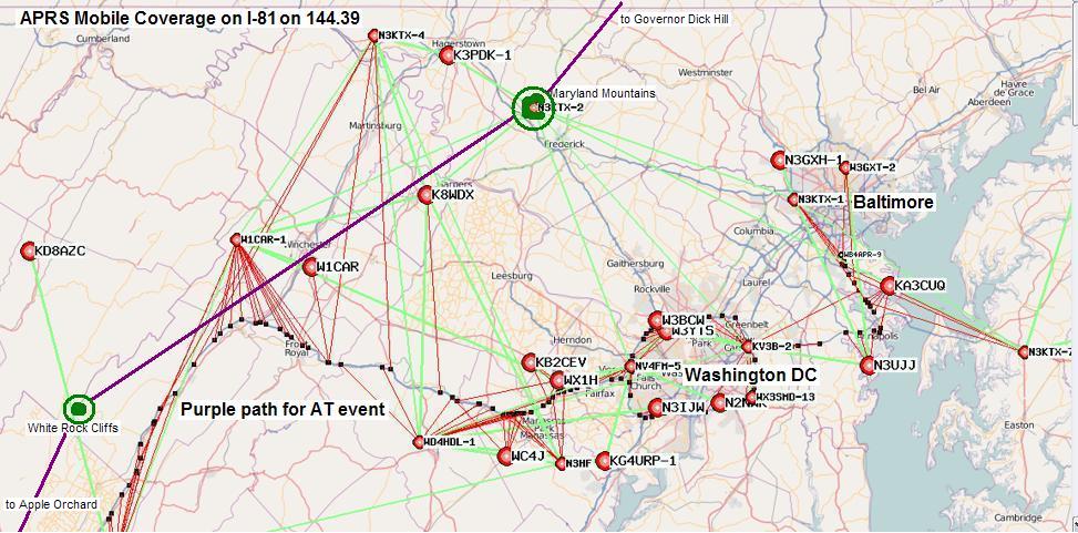 The map above shows the I-81 mobile APRS coverage using the existing digipeaters on 144.39. It happens to be a trace of my driving along I-66 and I-81 and does not really show a trace in the area of the Maryland Mountains, but you can still see where the digis are in that area. The intended AT special event path is shown in Purple.