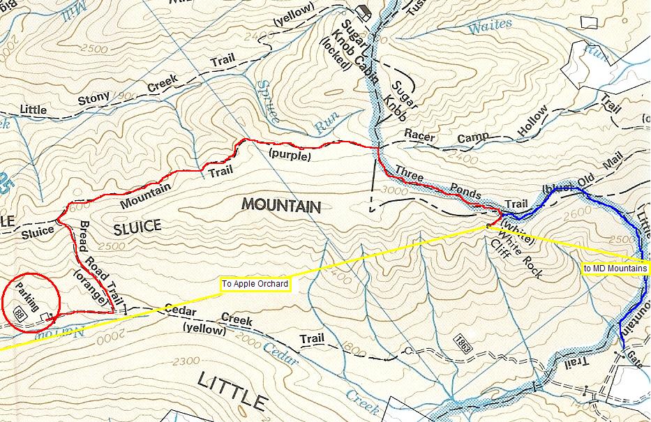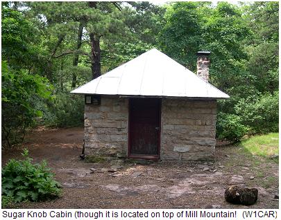 Chad Rudolph W1CAR [chad*chadrudolph.com] reports: Mill Mountain is only accessable by hiking trail. I've hiked it before from Wolf Gap to Sugar Knob ...and the cabin is Sugar Knob cabin which is owned by the PATC and normally closed unless rented by PATC hikers. You can see it in the image below. Sugar knob is about 4 miles from the trailhead. There is a side trail from a fire road to Big Schloss on Mill Mt. that is about 2 miles....but it is very steep and takes about 2hrs to ascend.