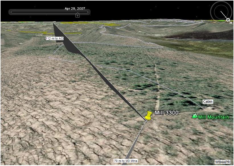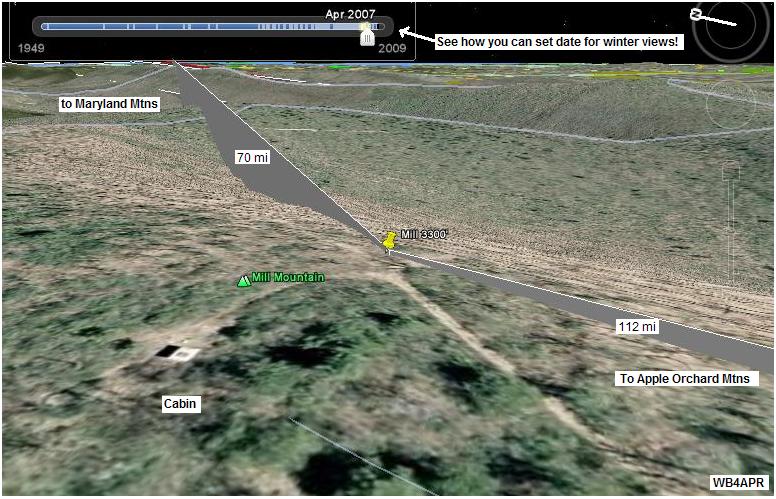 In this view, I have the Google Earth atmosphere turned off, so the sky is black even in daylight. Notice how much more revealing these views taken in April contrast with the heavy tree foleage of the first summer view. Operating from White Rock Cliff will solve the tree problem because both links are to the same side of the hill and the Cliffs will give us a station with no trees.