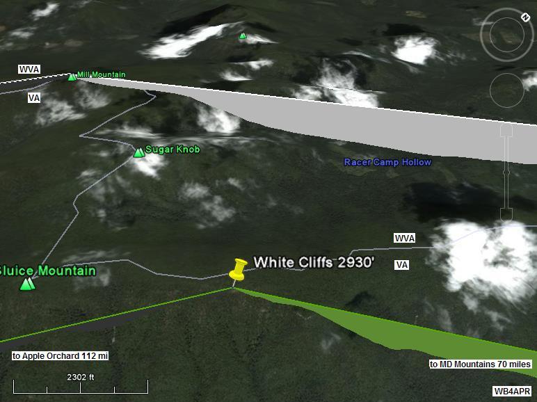 From this view and the radio paths from Apple Orchard and then on to Maryland Mountains shows that operating on this rock out-cropping will eliminate any need for antenna masts since both links are on this same side of the mountain. We need boots on the ground to confirm this site. The white lines in the image are the VA/WVA state line.