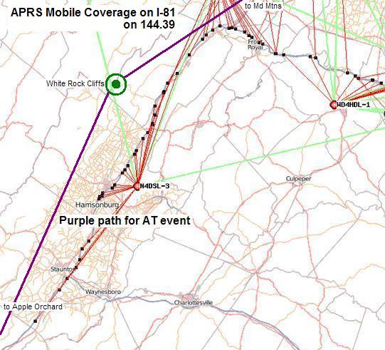 The image above is a plot of APRS mobile coverage on I-81 using 144.39 existing APRS system. In purple you can see the path we hope to use for the AT special event.