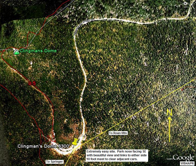 Eddie Foust [wd4jem*bellsouth.net] in 2009 reported: Clingmans Dome is the highest point along the AT at 6643 ft and has a tall public observation tower. Access to the tower is via a paved trail 0.5 miles long with 400 ft elevation change from the Forney Ridge Parking lot. The parking lot is accessed via a 7.6 mile road from US 441 at Newfound Gap. The Dome is wooded with evergreens, however, many of the trees have died over the years leaving a scrubby appearance. The walk up observation tower has limited space but it helps clear the height above the vegetation.
