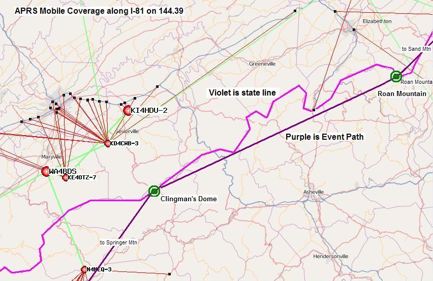 The map above shows the APRS coverage along I-81 in the vicinity of Clingmans and Roan mountain. This is one of the largest gaps in the 4000 mile long I-81 corridor. Maybe if we can raise the interest in APRS via this special event, we can get someone to put up a permanent digi along there.