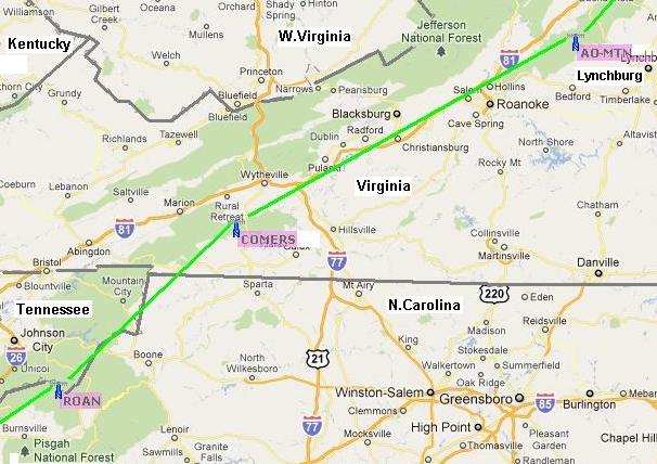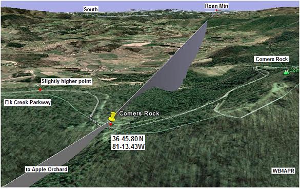 Comers Rock is located SE of Wythville in an ideal location that has a rare view between mountains back to Roan mountain with no obstructions and also has a view to the Northeast to Apple Orchard Mountain. It has a gravel road along the ridge so it could be operated from a mobile if a 50 foot mast was used to get above the trees. But it has a great campsite and walk-up access to the actual Comer's Rock lookout plaform with 360 degree views. Prior to finding Comers Rock, we had been looking at Sand Mountain but it is full of commercial RF equipment, locked access road, requires off-road vehicle and hams have difficult access to the 2m repeater and APRS digipeater there. For these reasons and to avoid RF intermod, we are now planning on using Comers Rock for its easy drive-up access and pleasant surroundings.