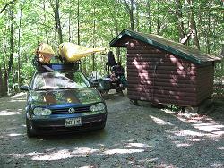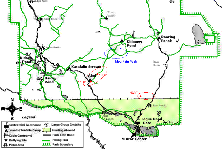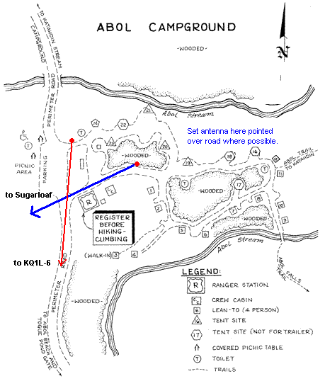 You can see the locations of these sites on the Baxter State Park map. Now, back in the campground. If a test can show this site is useable, maybe a short 20' mast and good beam strategically located to cut through the least number of trees might make the link.