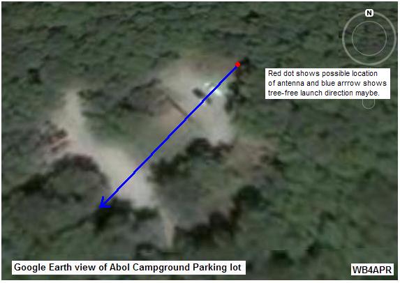 The campground should be pleasant during the event and Leanto's shown above are avaiailable on a reservation basis. Whoever is going to do this trip should get their reservations in early for the 26 July event. A good location for the beam antenna might be nestled at the northeastern end of a short road in the campground so that it can shoot back unobstructed for a hundred yards or so to the southweast and hopefull clear as many trees as possible beyond that as shown in the blue arrow in the image below.