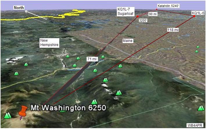 The path from Mt Washington to the KQ1L-6 digipeater is 91 miles appears to be a good link as shown by KX4O's analysis.